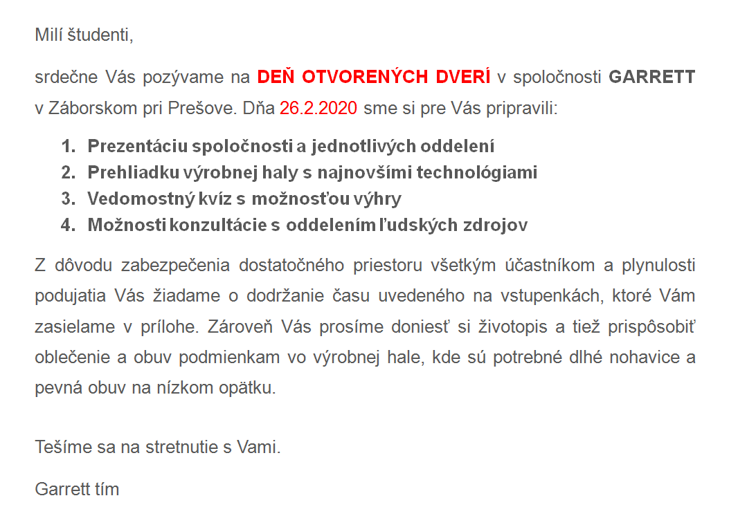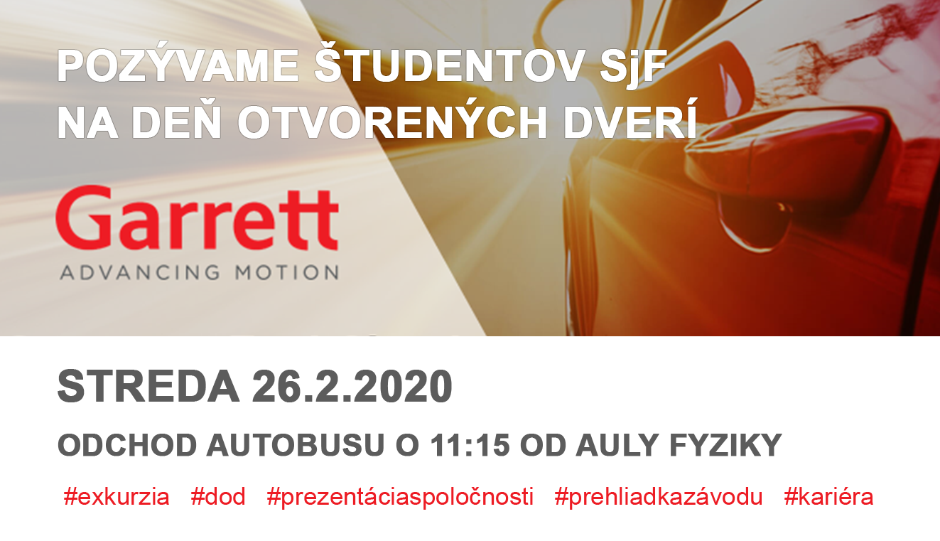Spoločnosť Garrett pozýva študentov našej fakulty na Deň otvorených dverí, túto stredu 26.2.2020. Odchod autobusu je od Auly Fyziky o 11:15 hod. Záujemcovia sa môžu hlásiť u docenta Štefana Markulika z KBaKP (miestnosť L9-A522) do 25.2.2020. Predpokladaný príchod je medzi 14:00 - 15:00. Študenti, ktorí sa exkurzie zúčastnia, budú ospravedlnení z vyučovania.