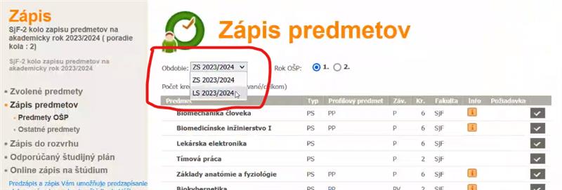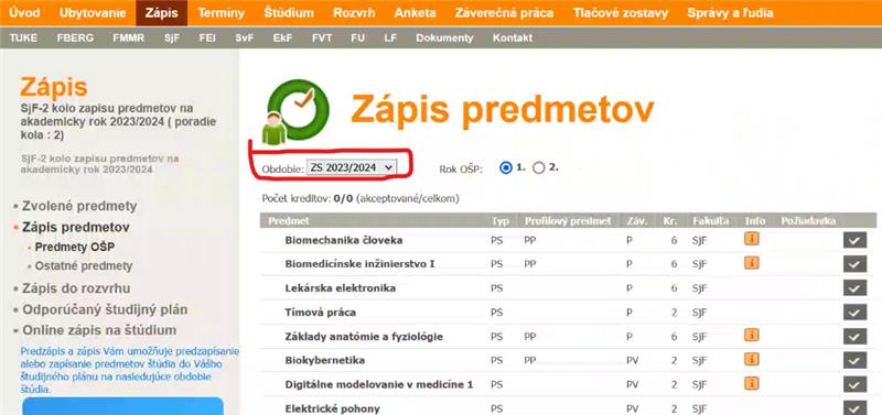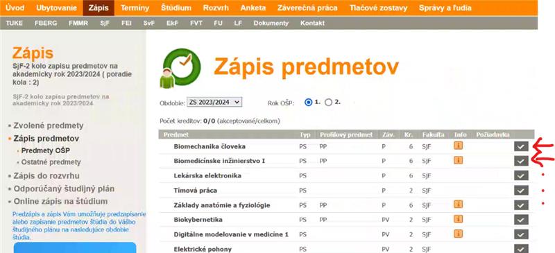 Postup pre e-zápis predmetov